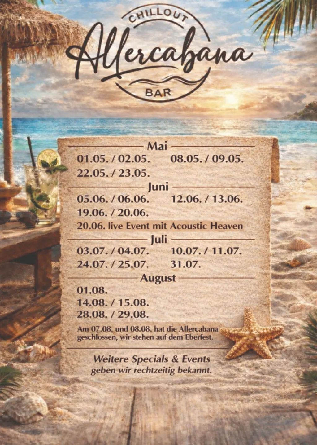 Besondere Highlights sind unsere geöffneten Wochenenden, an denen die Allercabana für alle Besucher kostenfrei von 15 bis 24 Uhr zugänglich ist. Genießen Sie diese exklusive Gelegenheit, unsere Location kennenzulernen und sich von unserem Ambiente bei Cocktails und Chillout Musik begeistern zu lassen.